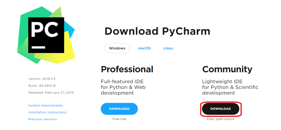 파이썬 다운로드 페이지(https://www.jetbrains.com/pycharm/download/#section=windows)에서 Community 버전을 다운로드해 설치하시면 됩니다.